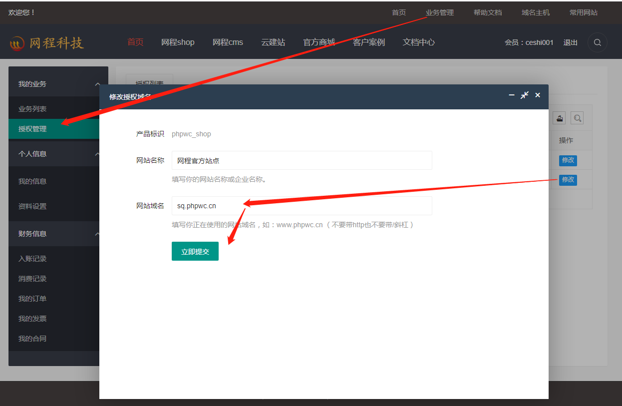 1、网站更换了域名,请登录本站点击右上角业务管理 - 授权管理,修改为正确域名: